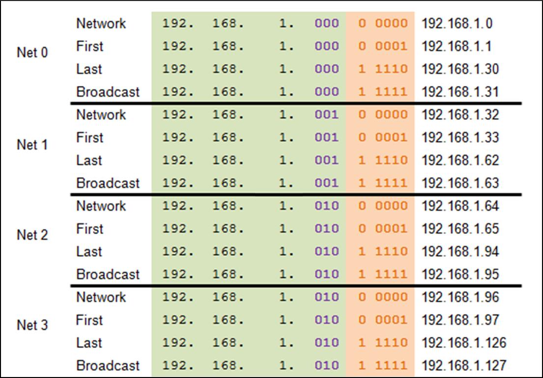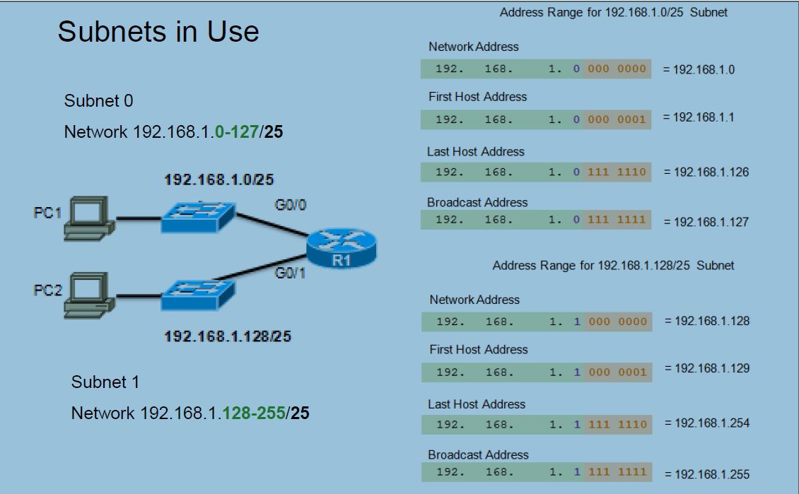 | Subnet 0 Network 192.168.1.0-127/25 Mask: 255.255.255.128 | Subnet 1 Network 192.168.1.128-255/25 Mask: 255.255.255.128 |
