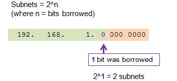 | Borrowing 1 Bit from the host portion creates 2 subnets with the same subnet mask | |