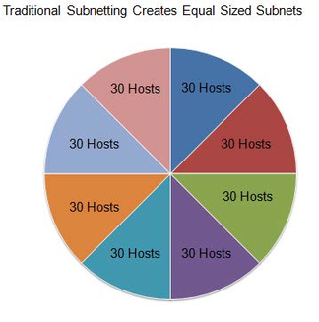| Traditional subnetting–Uses the same number of addresses is allocated for each subnet | Subnets that require fewer addresses have unused (wasted) addresses; for example, WAN links only need two addresses. |